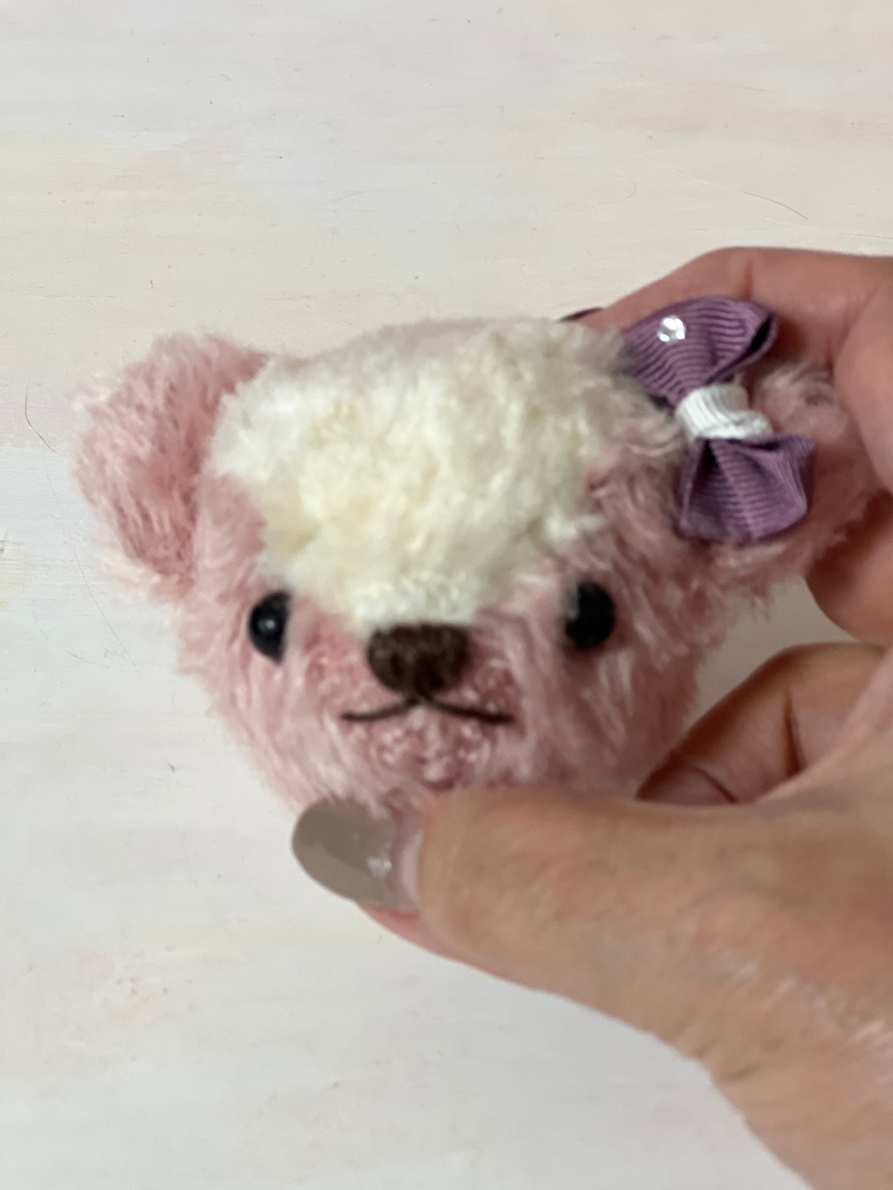 テディベアのお顔の部分だけのバッグチャームです。テディベアと同様に固く綿を詰めているのでへたることは少ないと思います。目は割れないようプラスチックアイにしています。